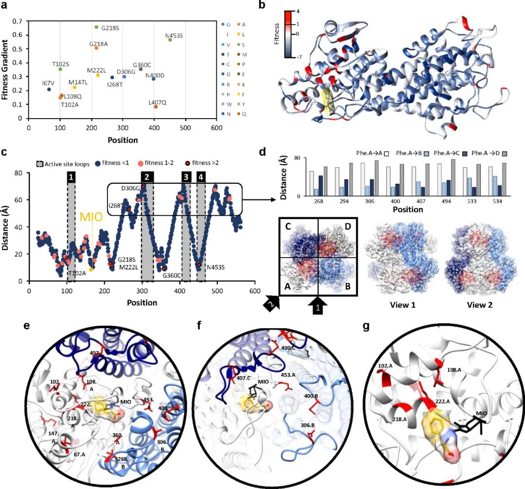 該團(tuán)隊此前開發(fā)了一種生長偶聯(lián)富集技術(shù),用于在大腸桿菌中快速篩選AvPAL的高活性變體。原理是高活性AvPAL變體可以更快地催化Phe脫氨生成NH4+,從而促進(jìn)大腸桿菌的生長?;诖思夹g(shù),作者對AvPAL進(jìn)行隨機(jī)突變獲得了Naive文庫,并傳代富集了3次。然后使用高通量篩選方法對AvPAL進(jìn)行DMS,獲得其詳細(xì)序列-功能圖譜(圖2)。在第3代的突變體文庫中,218、222和453位點的突變高度富集(圖2a)。Naive文庫每個基因包含大約2-4個氨基酸突變,突變分布廣泛(565個殘基),每個殘基平均有5.6個替換。而第3代中只有222個位置有突變,且平均只有0.6個突變(圖2b)。負(fù)適應(yīng)度(灰色)指的是在傳代過程中出現(xiàn)頻率下降的突變,而適應(yīng)度最高的“熱點”T102、G218、M222L、I268、D306、G360、N453被用于后續(xù)研究(圖2c)。通過對比,作者發(fā)現(xiàn)適應(yīng)度得分與酶的催化活性具有很高的相關(guān)性。