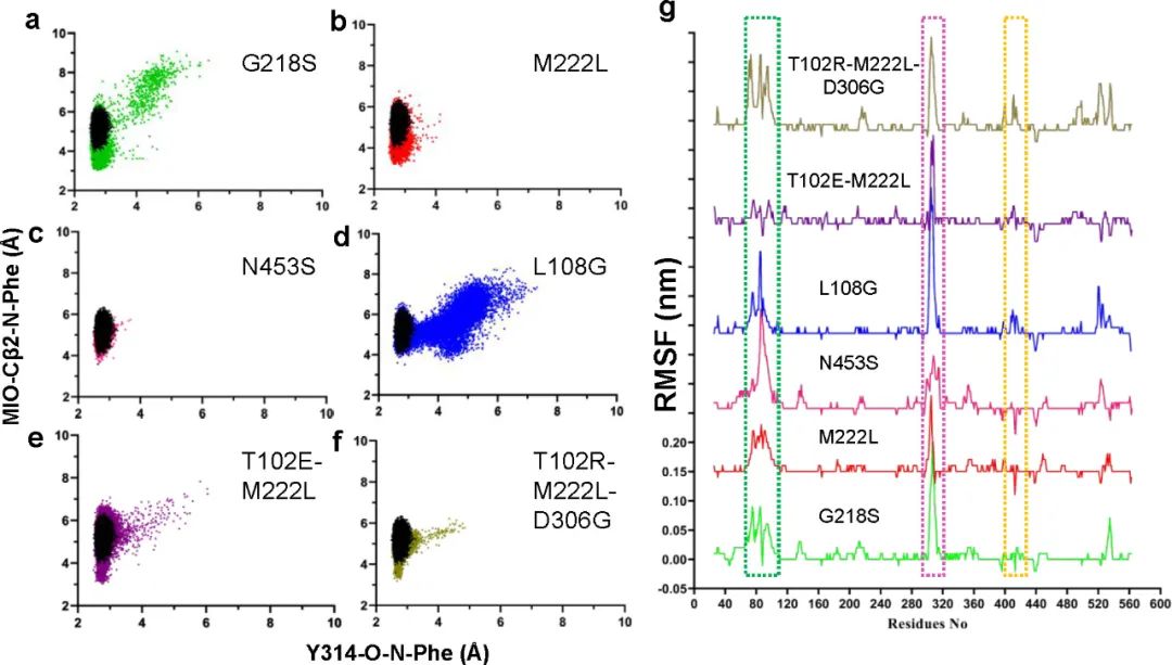 為了揭示酶活增加的機(jī)制,作者對各突變體進(jìn)行MD模擬分析。在MD模擬期間底物和催化殘基之間的緊密接近表明穩(wěn)定的E-S復(fù)合物和近攻擊構(gòu)象的形成。通過測量變體的底物氨基氮(Phe(N))與MIO亞甲基碳(MIO(Cβ2))和相鄰鏈上314位酪氨酸羥基氧(Y314(O))之間的距離,以及對比蛋白質(zhì)主鏈原子的均方根波動(RMSF),發(fā)現(xiàn)對于五種高活性變體中的四種(M222L、G218S、T012E-M222L和T102R-M222L-D306G),底物更容易接近催化位點形成穩(wěn)定的近攻擊構(gòu)象(圖5)。然而,N453S與親本相比基本沒有變化,這表明其作用方式可能不涉及直接調(diào)節(jié)底物和催化殘基之間的相互作用。