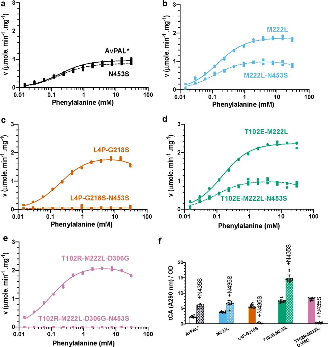接著作者假設(shè)N453S與其他突變體結(jié)合可能會進(jìn)一步提高酶活性,并構(gòu)建了M222L、L4P-G218S、T102E-M222L和T102R-M222L-D306G的N453S突變體。通過評估純酶的動力學(xué)(圖7a-e)和Phe到tCA的全細(xì)胞轉(zhuǎn)化(圖7f),發(fā)現(xiàn)添加N453S的變體都顯示出與親本相似的動力學(xué)參數(shù),且vmax都有所降低,但T102E-M222L-N453S對Phe的轉(zhuǎn)化率卻提高了6倍以上。作者假設(shè)Phe可能更容易從活性位點取代 tCA從而減少了產(chǎn)物抑制,并隨后通過添加產(chǎn)物的方式驗證了該假設(shè)。