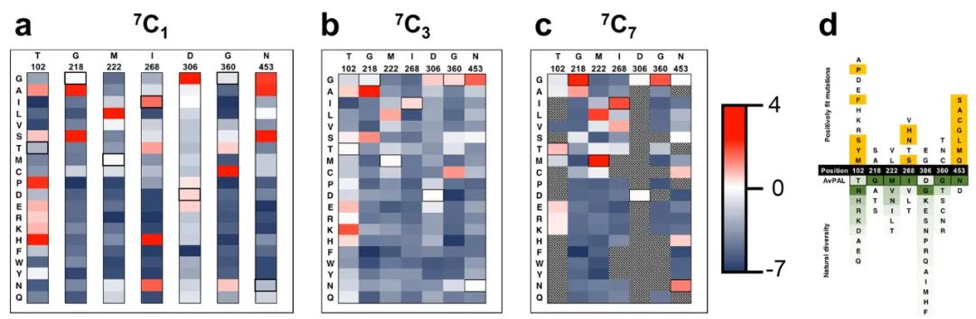 作者利用7個熱點分別構(gòu)建了包含一個(7C1 7選1),三個(7C3 7選3),七個(7C7 7選7)位點突變的組合突變庫。7C1文庫中所有位點都有比野生型更適合的替換(圖 4a),而7C3和7C7文庫中較少的突變具有積極的適應(yīng)度得分(圖 4b 和 c)。這表明雖然許多突變單獨有助于提高適應(yīng)度,但大多數(shù)突變并不協(xié)同作用。對與AvPAL同源性最高的100個蛋白質(zhì)進(jìn)行序列比較,發(fā)現(xiàn)對于218、222、306和360位點,天然序列中完全涵蓋了研究中發(fā)現(xiàn)的最適合的變體。而對于102、268和453位點,發(fā)現(xiàn)了僅通過序列比對無法預(yù)測的新突變(圖4d)。其中,T102E-M222L和T102R-M222L-D306G的kcat分別顯示出2.4倍和2.25倍的改進(jìn)。